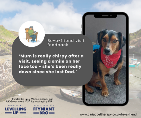 Be-a-friend follows on from the support provided by Dogs on your Doorstep that Cariad Pet Therapy ran alongside the Therapy Dog visits. Be-a-friend is a stand-alone service, funded by The National Lottery Community Fund.